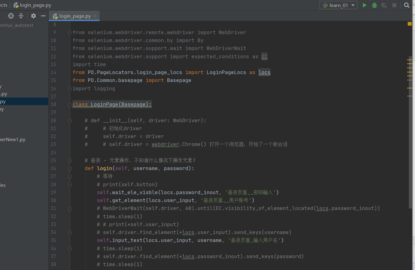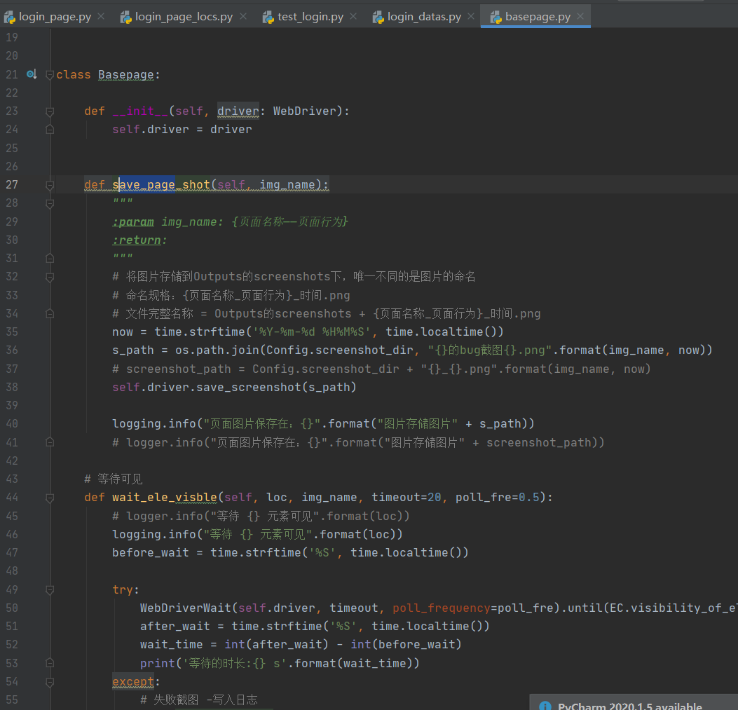 1、要简化页面操作的代码,需要对元素的基本操作进行二次封装了basepage类,所以封装好后让PageObjects的每个页面操作来继承即可使用,大大的简化了代码的输出