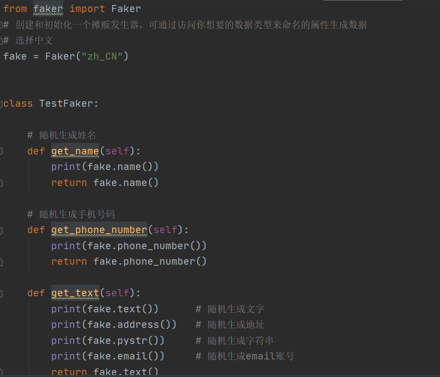 在这里记录一下如何使用Faker的方法,具体详情可见官方文档:https://faker.readthedocs.io/en/master