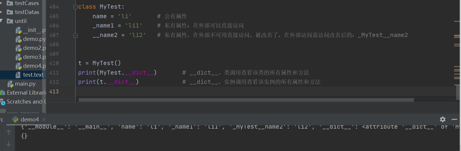 -- 实例调用__dict__属性,返回的值实例相关的属性和方法,如查看类的所有属性和方法:print(Test.__dict__)
