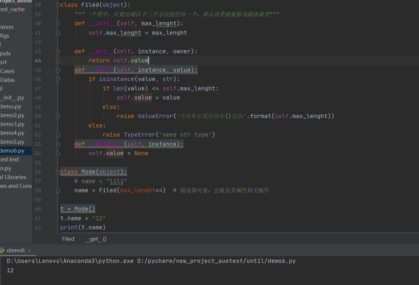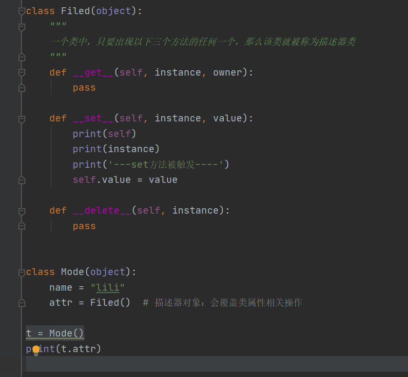例子中的t.attr是访问Mode类的属性attr,但实际是访问Filed这个描述器中的__get__方法