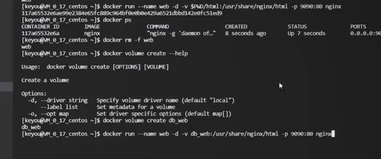 删除:docker volume rm [ OPTIONS ] VOLUME [ VOLUME... ]