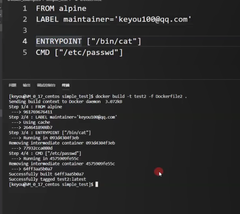 先cd到对应的目录下,运行构建test2:v1(镜像名称:镜像标签)命令: