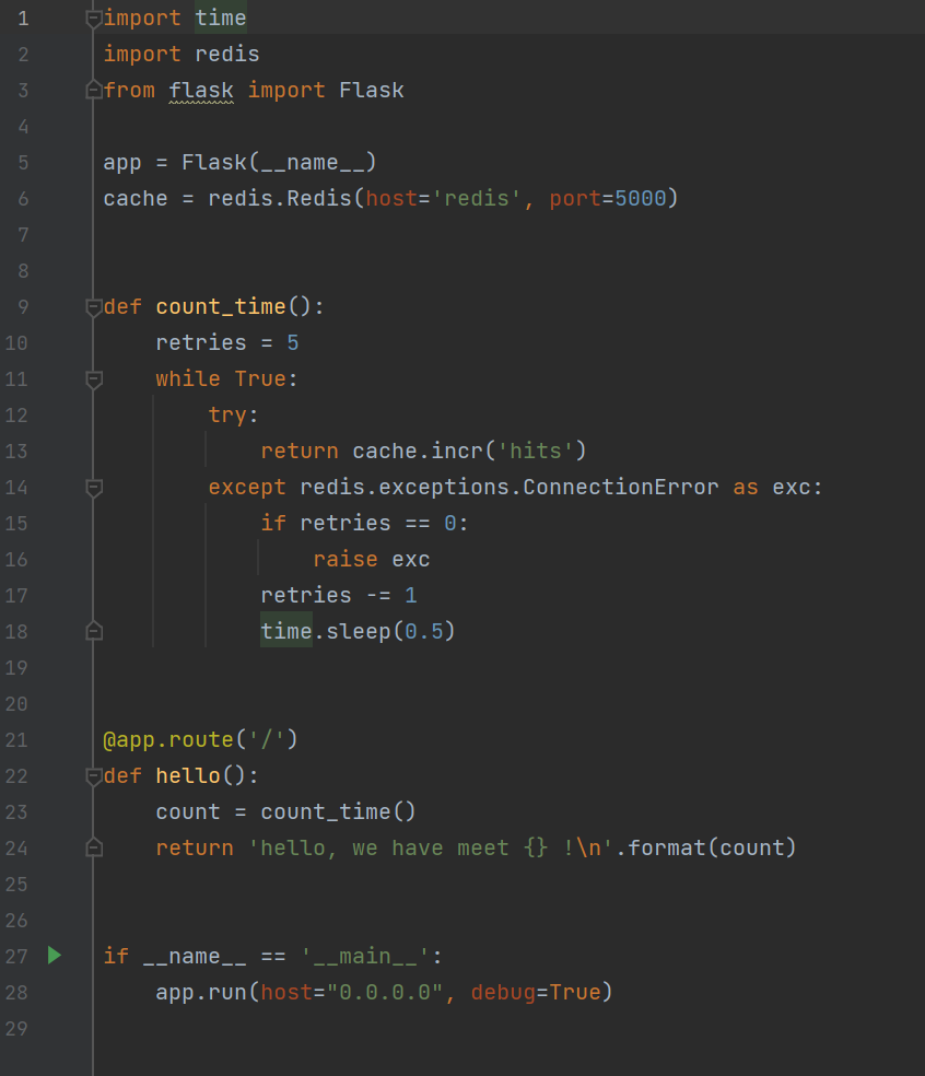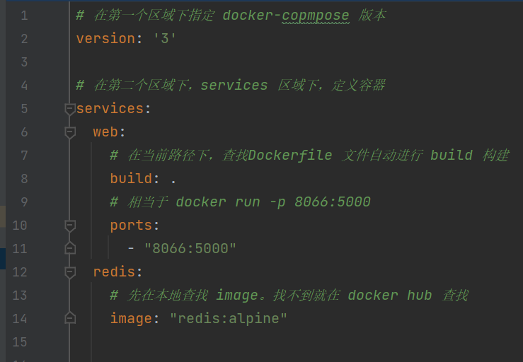 3、在项目目录中创建 docker-compose.yml 文件,在 services 区域下定义两个web 和redis 容器: