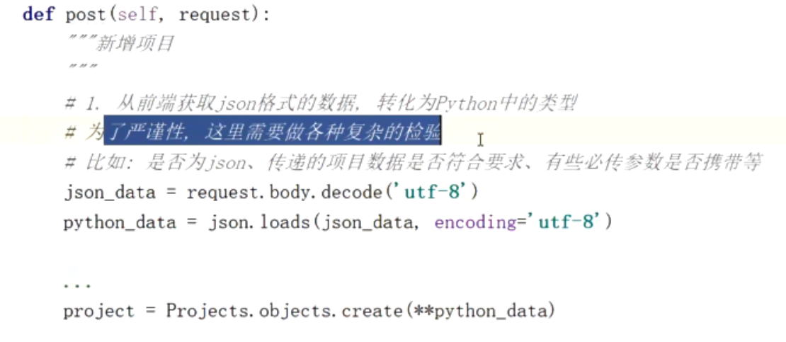 将请求的数据(如json格式)转换为模型类对象,从前端获取json 格式的数据,转化成Python 的类型,为了严谨性,这里需要做各种复杂的检验,如是否为json,传递的项目数据是否符合要求,有些必传参数是否携带等