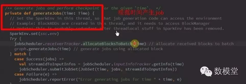 * 1,JobGenerator启动后会不断的根据batchDuration生成一个个的Job