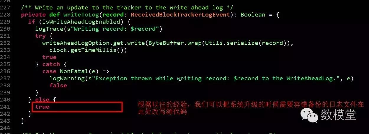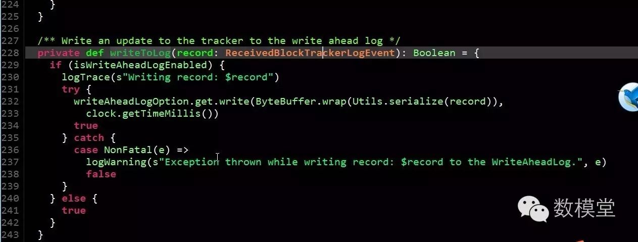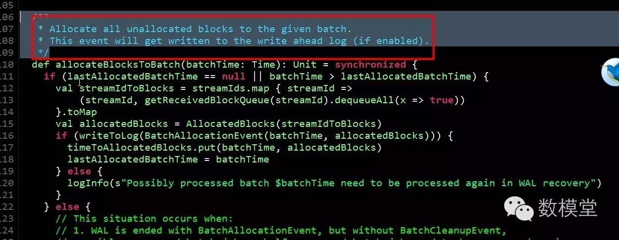 writeToLog(BlockAdditionEvent(receivedBlockInfo))写入WAL成功之后,才会将元数据( getReceivedBlockQueue(receivedBlockInfo.streamId) += receivedBlockInfo)加入到队列中。加入到内存队列中方便JobGenerator等作业的调度。