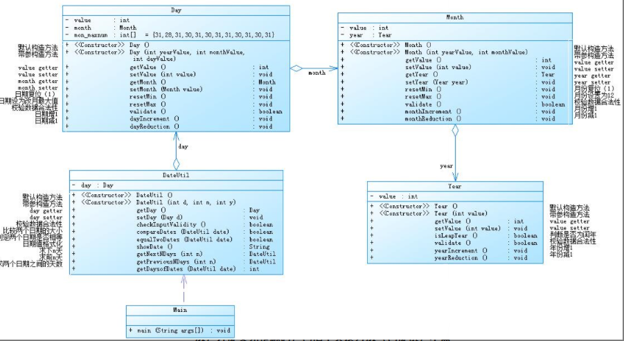 日期聚合一:首先根据类图理清类于类之间的关系,本题采用聚合关系来编写程序,DateUtil←Day←Month←Year。在DateUtil声明Day类的对象day并构造函数,根据类图写出相应函数及其功能,Day d从Day类中获取但day的参数在Day类中传入