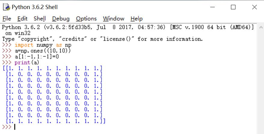[1. 1. 1. 1. 1. 1. 1. 1. 1. 1.]import numpy as np a=np.ones((10,10)) a[1:-1,1:-1] = 0 pirnt(a)