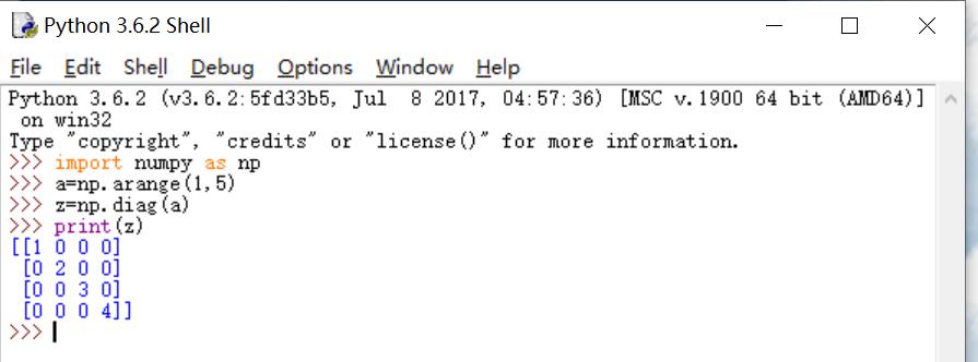 [0 0 0 4]import numpy as np a = np.arange(1,5) z = np.diag(a) print(z)
