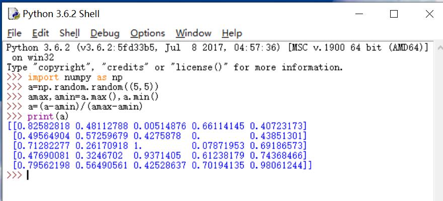 生成一个随机的5*5矩阵,找出最大值和最小值,然后把最大值和最小值分别用1和0表示,其他值则介于在0和1中间。import numpy as np a=np.random.random((5,5)) amax,amin=a.max(),a.min() a=(a-amin)/(amax-amin) print(a)