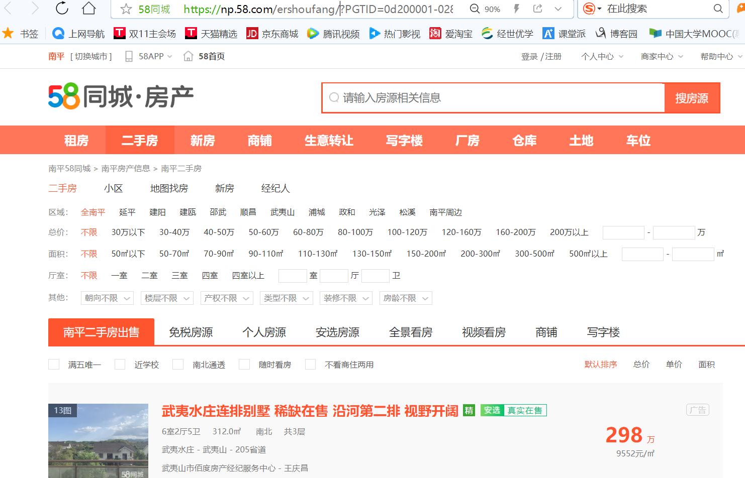 通过对58同城的页面爬取与分析,了解到南平房产出售的位置、总价、面积、厅室等等相关信息。