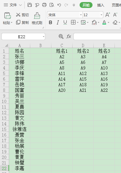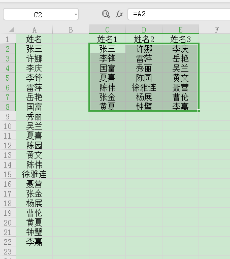 1、在另起空格填写A2(第一个名字单元格)向右拖动,另起一行接着结束单元格填充A5向右拖动,全选两行向下拖动至长列结束。