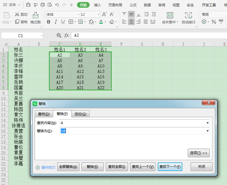 2、选中A的区域,Ctrl+H,把A替换成=A,点击全部替换,即可完成转换。