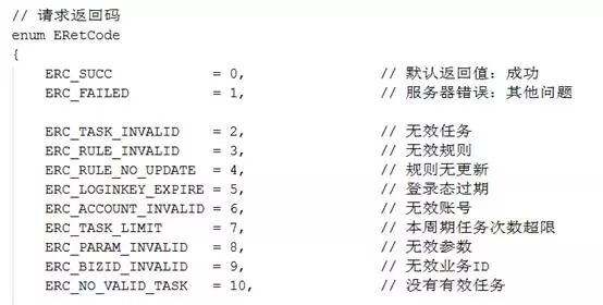 接口处理正确的结果可能只有一个,但是错误异常返回结果有很多情况很多值。如果知道返回结果有很多种,就可以针对不同结果设计用例。例如提交积分任务的时候我们通常能想到的是返回正确和错误,错误可能想到:无效任务,无效登录态,但是不一定能否完全覆盖所有错误码,而接口返回定义的返回码可以设计更多用例: