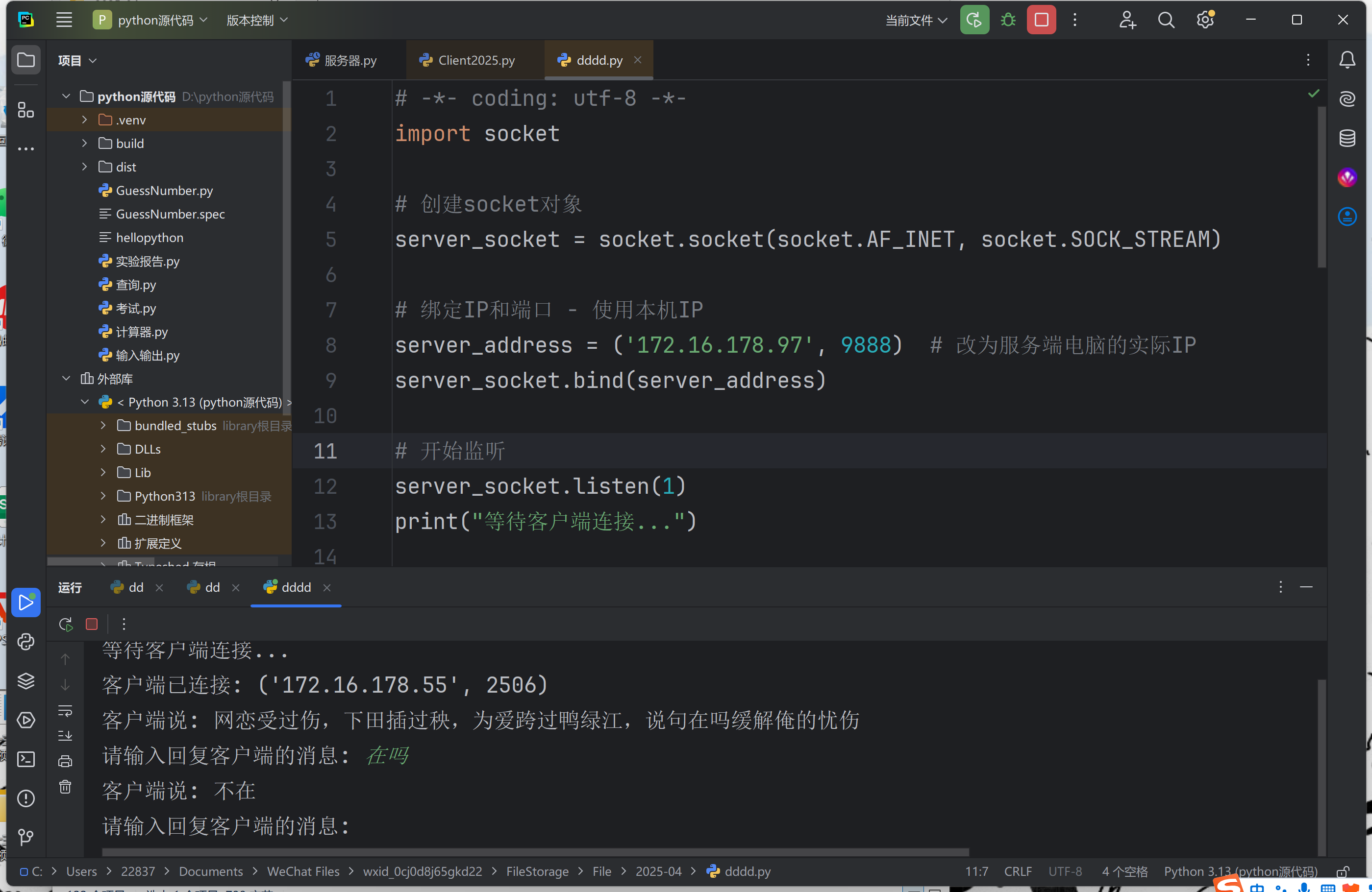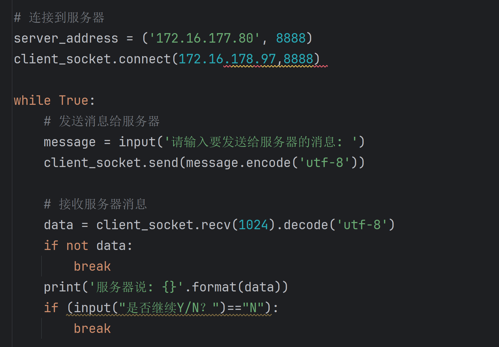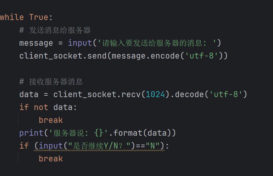 2.创建服务器/客户端,填写服务器地址,创建监听次数,以while循环保障对话进行