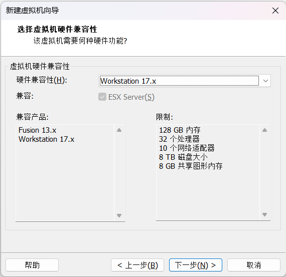 3、虚拟机硬件兼容性,选择自己的VMWARE版本