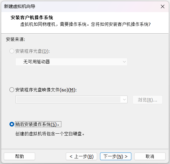 4、选择稍后安装操作系统,完成后别忘了添加ISO镜像文件(镜像文件我提前下载过了)