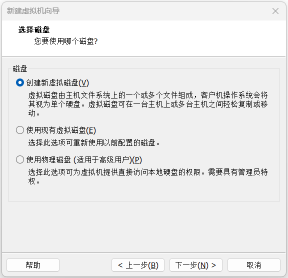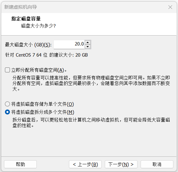 11、选择磁盘,咱们选择创建新的虚拟磁盘即可,然后最大磁盘大小(模拟)选择20GB就够用了;将虚拟磁盘储存为单个文件。