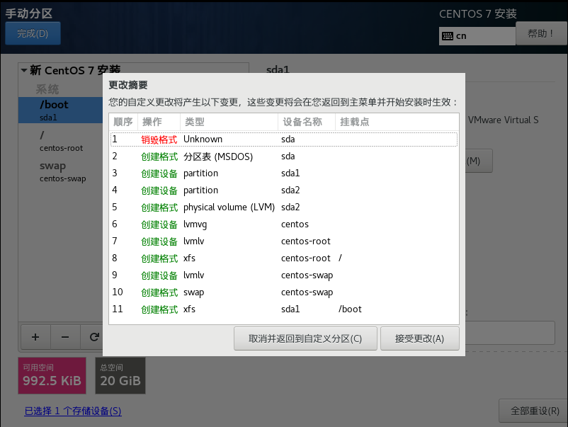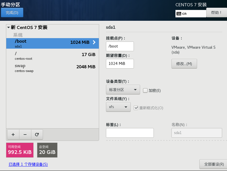 划分为/boot / swap分区,点进来就是这样,我就没改了,然后点击完成。这里也比较复杂,后面再专门详细说说。