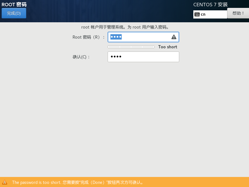 点击root密码并输入,因为是个人使用,我配置了个弱口令,系统提示密码too short,但是你强制使用这个密码也可以。