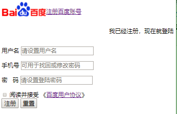 1 <!DOCTYPE html> 2 <html lang="en"> 3 <head> 4 <meta charset="UTF-8"> 5 <title>register</title> 6 </head> 7 <body> 8 <div style="overflow: hidden" class="head"> 9 <div class="head-left" style="float: left " > 10 <img src="https://passport.baidu.com/static/passpc-base/img/logo/baidu.gif" alt="logo"> 11 </div> 12 <div> 13 <a href="https://www.baidu.com/"><p>注册百度账号</p></a> 14 </div> 15 <div class="head-right" style="float: right"> 16 <p>我已经注册,现在就登陆</p> 17 </div> 18 </div> 19 <p></p> 20 21 <div class="content"> 22 <!--注意协议:HTTP,传数据方式最好用post,enctype:表单数据加密方式--> 23 <form action="http://127.0.0.1:8001" method="post" ENCTYPE="multipart/form-data"> 24 <p> 25 <!--for的内容对应input中的id--> 26 <label for="user">用户名</label> 27 <input type="text" id="user" name="用户名" value="" placeholder="请设置用户名"> 28 </p> 29 <p> 30 <label for="phonenum">手机号</label> 31 <!--注意:name是服务端接收的key,value是服务端接收的输入框内容--> 32 <input type="text" id="phonenum" name="手机号" value="" placeholder="可用于找回或修改密码"> 33 </p> 34 <p> 35 <label for="pwd">密   码</label> 36 <input type="password" id="pwd" name="密码" value="" placeholder="请设置登陆密码"> 37 </p> 38 39 <input type="checkbox" name="同意" value="ok"> 40 阅读并接受 《<a href="https://passport.baidu.com/static/passpc-account/html/protocal.html">百度用户协议</a>》 41 <br/> 42 <input type="submit" value="注册"> 43 <input type="reset" value="重置"> 44 </form> 45 </div> 46 </body> 47 </html>