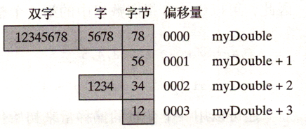 .386 .model flat,stdcall .stack 4096 ExitProcess PROTO,dwExitCode:DWORD .data myDouble DWORD 12345678h .code main PROC mov eax,0 mov ax,WORD PTR myDouble ;EAX = 00005678 mov ebx,0 mov bx,WORD PTR myDouble+1 ;地址加1个字节,EBX = 00003456 mov ecx,0 mov cx,WORD PTR myDouble+2 ;ECX = 00001234 mov edx,0 mov dx,WORD PTR myDouble+3 ;EDX = 00000012 ;78 56 34 12 INVOKE ExitProcess,0 main ENDP END main