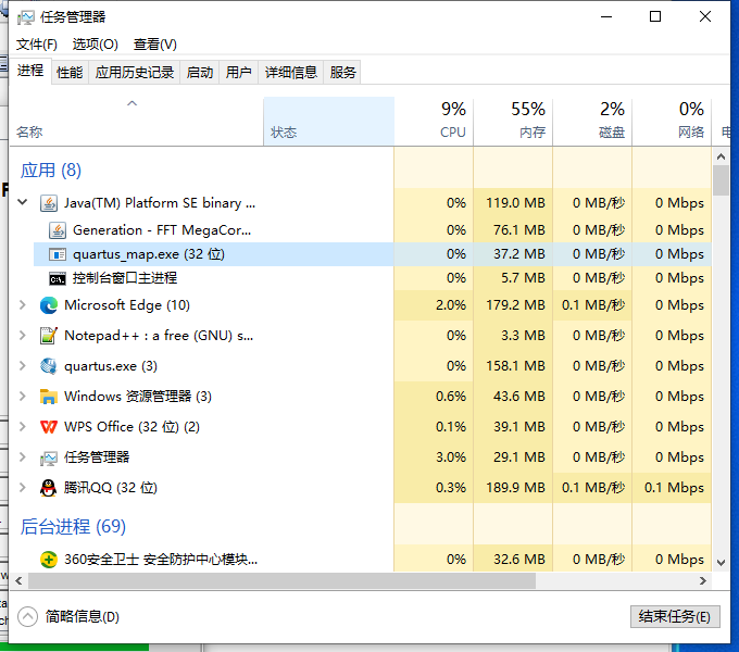 据网友表示,遇到这个问题时,在任务管理器中手动关闭quartus_map进程就可以了