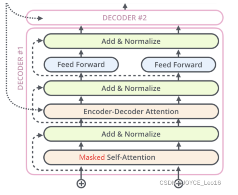 每个解码器层都有三个子层,掩码自注意力层(Masked Self-Attention)、Encoder-Decoder自注意力层、逐位置的前馈神经网络。同样,在每个子层后面都有残差连接(图中的虚线)和层归一化(LayerNorm)操作,二者合起来称为 Add&Norm操作。