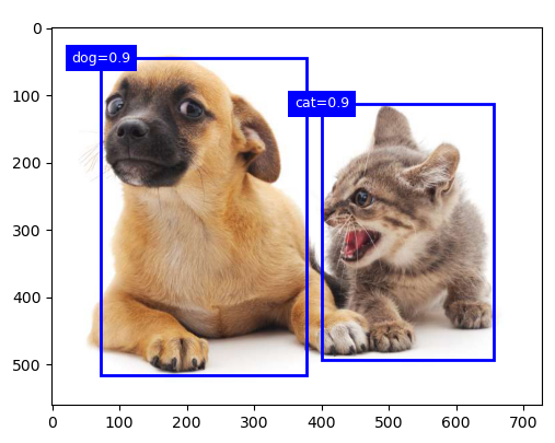 show_bboxes(fig.axes, anchors * bbox_scale,['dog=0.9', 'dog=0.8', 'dog=0.7', 'cat=0.9'])