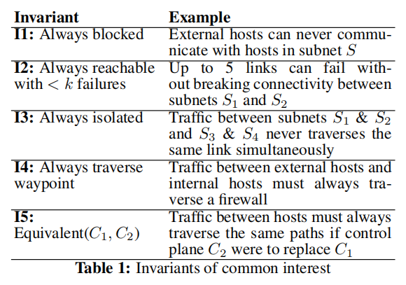 - 为了避免在故障场景下出现不良结果,操作人员要求网络中关键的安全性和可用性不变量始终保持(即使在任意故障下)。
