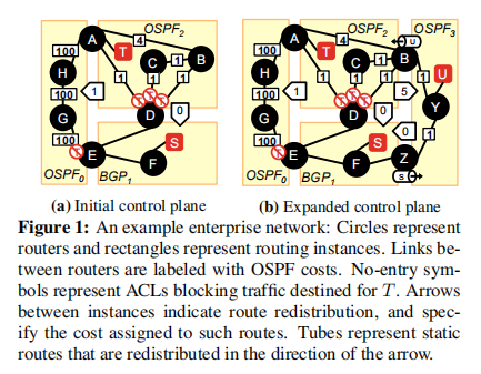 控制平面配置复杂。网络的路由控制平面使用一个或多个分布式路由协议(如,OSPF、RIP和BGP)生成数据平面(即,转发表)。现有工作表明路由协议交互在现代网络中可能相当复杂。因此,控制平面容易出现配置错误,并危及网络安全性、可用性和性能。