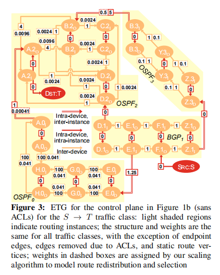 - I4: Always traverse a waypoint. 当网络包含中间盒(如,防火墙)时,操作人员可能希望流量在任意故障场景下始终穿越中间盒的某个实例(即,waypoint)。从ETG中删除所有的waypoints顶点,并检查是否存在从SRC顶点到DST顶点的路径。如果存在这样的路径,那么就有一些可能不穿越waypoint的路径,将此路径作为反例返回。