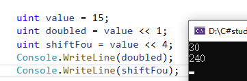 uint value = 15 // 00001111 uint doubled = value << 1; // value = 00011110 = 30 uint shiftFour = value << 4; // value = 11110000 = 240 uint value = 240; // 11110000 uint halved = value >> 1; // Result = 01111000 = 120 uint shiftFour = value >> 4; // Result = 00001111 = 15
