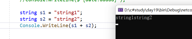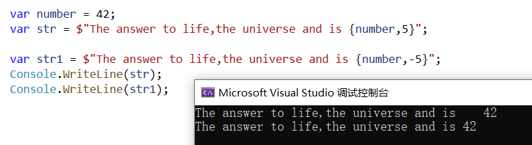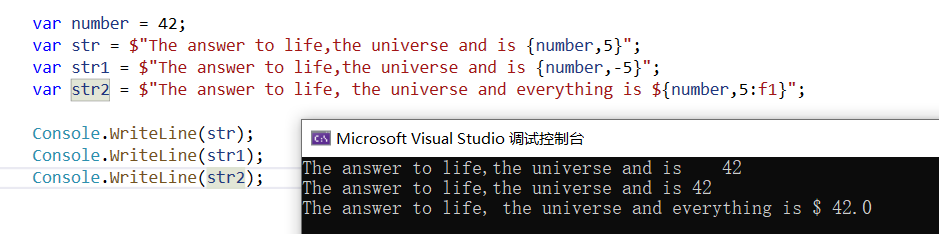 1 var str1 = "text1"; 2 var str2 = " "; 3 var str3 = "text3"; 4 string result2 = $"{str1}{str2}{str3}";//"text1 text3"