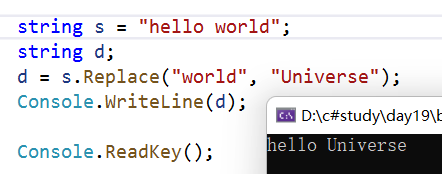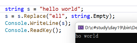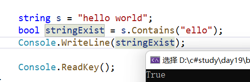 1 string s = "Hello World"; 2 int location = s.IndexOf("ello"); // location = 1 查找“字串”的第一个字符在s中的索引值(位置) 3 string s = "Hello World"; 4 int location = s.LastIndexOf("l"); // location = 9 查找“字”的倒数字符在s中的索引值(位置)
