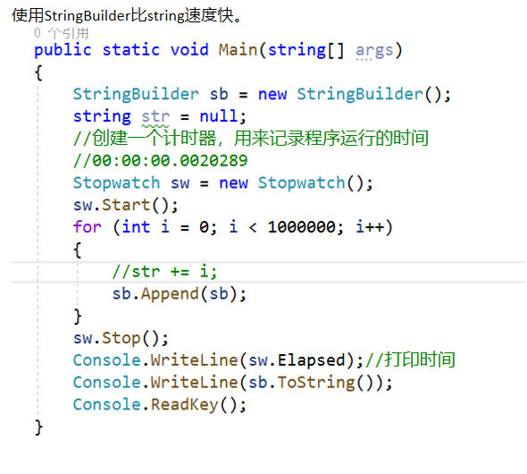 1 StringBuilder builder = new StringBuilder(10); 2 for (int i = 1; i < 10; i++) 3 { 4 builder.Append(i); // 0123456789 5 }
