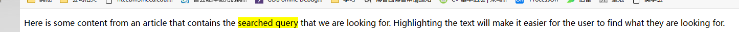<p> Here is some content from an article that contains the <mark>searched query<mark> that we are looking for. Highlighting the text will make it easier for the user to find what they are looking for. </p>
