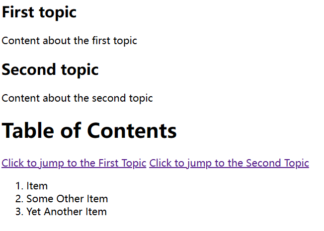 <h2 id="Topic1">First topic</h2> <p>Content about the first topic</p> <h2 id="Topic2">Second topic</h2> <p>Content about the second topic</p>