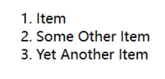 <ol> <li>Item</li> <li>Another Item</li> <li>Yet Another Item</li> </ol>