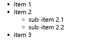 <ul> <li>item 1</li> <li>item 2 <ul> <li>sub-item 2.1</li> <li>sub-item 2.2</li> </ul> </li> <li>item 3</li> </ul>