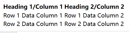 <table> <tr> <th>Heading 1/Column 1</th> <th>Heading 2/Column 2</th> </tr> <tr> <td>Row 1 Data Column 1</td> <td>Row 1 Data Column 2</td> </tr> <tr> <td>Row 2 Data Column 1</td> <td>Row 2 Data Column 2</td> </tr> </table>