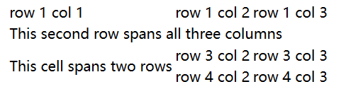 <table> <tr> <td>row 1 col 1</td> <td>row 1 col 2</td> <td>row 1 col 3</td> </tr> <tr> <td colspan="3">This second row spans all three columns</td> </tr> <tr> <td rowspan="2">This cell spans two rows</td> <td>row 3 col 2</td> <td>row 3 col 3</td> </tr> <tr> <td>row 4 col 2</td> <td>row 4 col 3</td> </tr> </table>