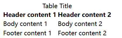 <table> <caption>Table Title</caption> <!--| caption is the first child of table |--> <thead> <!--======================| thead is after caption |--> <tr> <th>Header content 1</th> <th>Header content 2</th> </tr> </thead> <tbody> <!--======================| tbody is after thead |--> <tr> <td>Body content 1</td> <td>Body content 2</td> </tr> </tbody> <tfoot> <tr> <td>Footer content 1</td> <td>Footer content 2</td> </tr> </tfoot> </table>