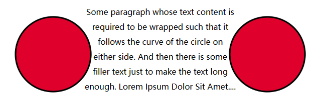<head> <meta charset="utf-8"> <style> img:nth-of-type(1) { shape-outside: circle(80px at 50% 50%); float: left; width: 200px; } img:nth-of-type(2) { shape-outside: circle(80px at 50% 50%); float: right; width: 200px; } p { text-align: center; line-height: 30px; } </style> </head> <body> <img src="http://images.clipartpanda.com/circle-clip-art-circlergb.jpg"> <img src="http://images.clipartpanda.com/circle-clip-art-circlergb.jpg"> <p>Some paragraph whose text content is required to be wrapped such that it follows the curve of the circle on either side. And then there is some filler text just to make the text long enough. Lorem Ipsum Dolor Sit Amet....</p> </body>