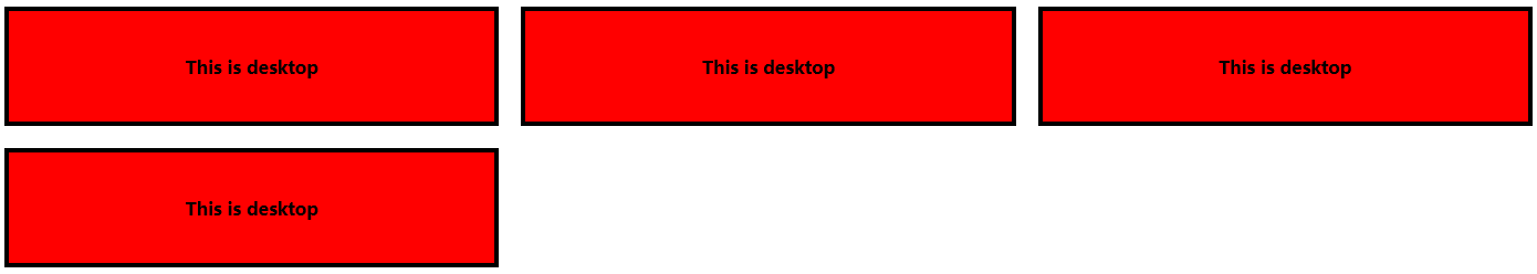 <head> <meta charset="utf-8"> <style> :root { --width: 25%; --content: 'This is desktop'; } @media only screen and (max-width: 767px) { :root { --width: 50%; --content: 'This is mobile'; } } @media only screen and (max-width: 480px) { :root { --width: 100%; } } div { width: calc(var(--width) - 20px); height: 100px; } div:before { content: var(--content); } body { padding: 10px; } div { display: flex; align-items: center; justify-content: center; font-weight: bold; float: left; margin: 10px; border: 4px solid black; background: red; } </style> </head> <body> <div></div> <div></div> <div></div> <div></div> </body>