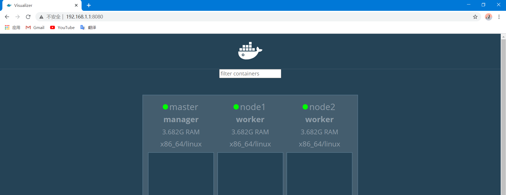 [root@master ~]# docker run -d -p 8080:8080 -e HOST=192.168.1.1 -e PORT=8080 -v /var/run/docker.sock:/var/run/docker.sock --name visualizer dockersamples/visualizer b793e13b3da9ab9f4c6a19c88a4274ba752b2e87c659294de6571d8d55884872 [root@master ~]# docker ps CONTAINER ID IMAGE COMMAND CREATED STATUS PORTS NAMES b793e13b3da9 dockersamples/visualizer "npm start" 5 seconds ago Up 4 seconds (health: starting) 0.0.0.0:8080->8080/tcp visualizer
