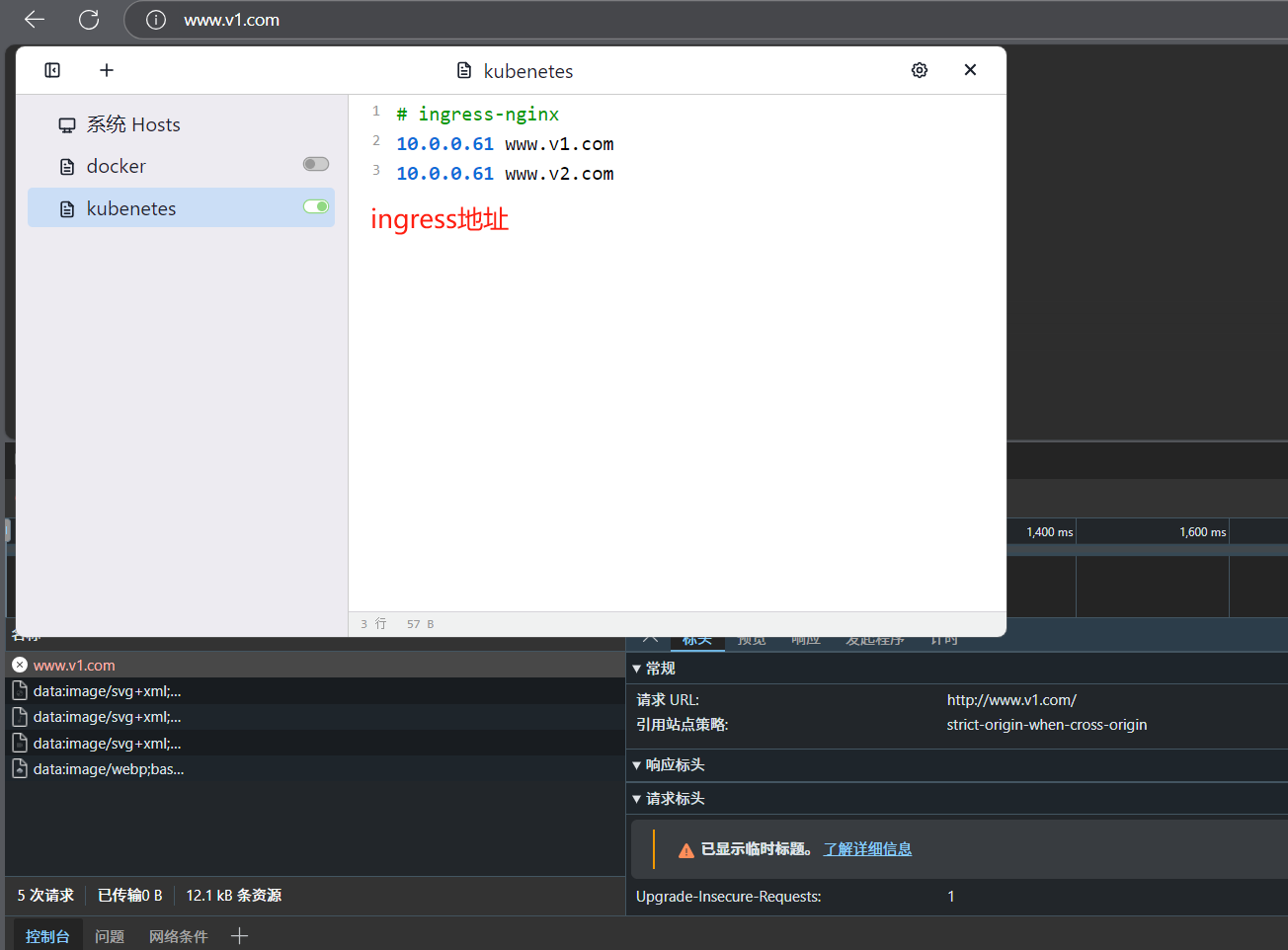 部署2个nginx-deployment内容v1&&v2,结合ingress作为入口分别访问。访问ingress-入口失败