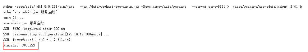 #!/bin/bash nohup /data/soft/jdk1.8.0_231/bin/java -jar /data/wechart/ace-admin.jar -Dace.home=/data/wechart --server.port=9631 > /data/wechart/ace-admin.nohup 2>&1 & echo "ace-admin.jar 服务启动" exit 0