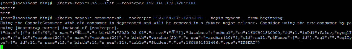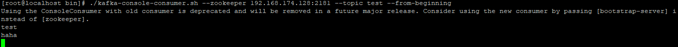 [root@localhost bin]# ./kafka-console-consumer.sh --zookeeper 192.168.174.128:2181 --topic test --from-beginning