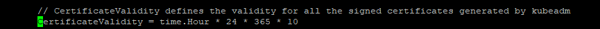 # 打开文件 vi cmd/kubeadm/app/constants/constants.go # 如下 默认是 1年, 修改为 10 年 CertificateValidity = time.Hour * 24 * 365 # 修改为 CertificateValidity = time.Hour * 24 * 365 * 10